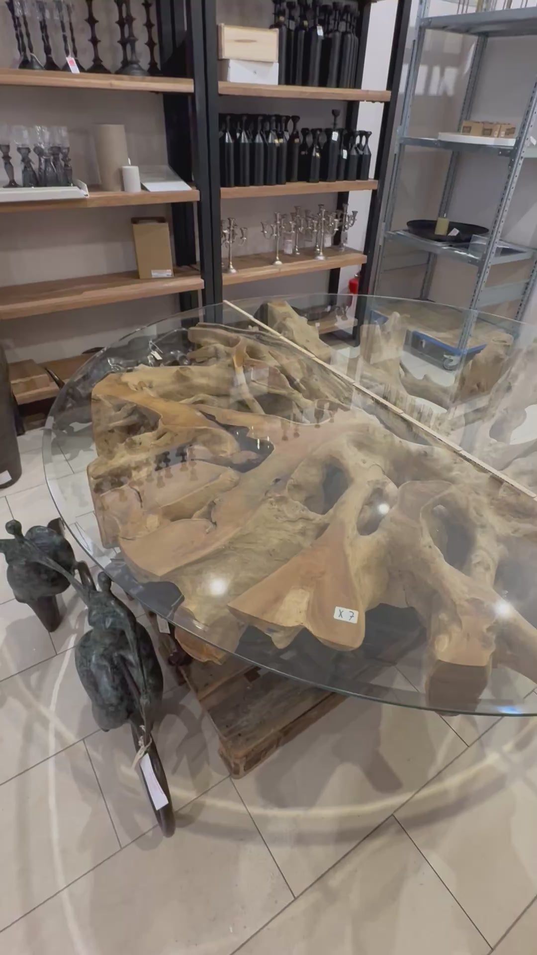 - runder Glastisch auf einer Teakwurzel